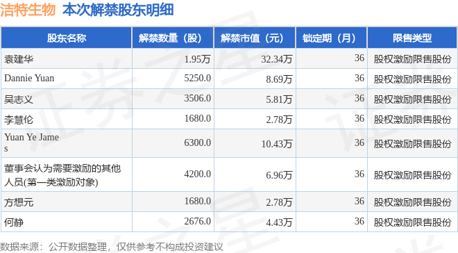 证券之星消息,根据市场公开信息整理,洁特生物(688026)于7月11日将有4.48万股限售股份解禁,为公司股权激励限售股份,占公司总股本0.03%。(本次数据根据历史公告整理得出,实际情况以上市公司最新公告为准)最近一年内,该股累计解禁7.29万股,占总股本的0.05%。本次解禁后,公司还有4.48万股限售股份,占总股本0.03%。具体如下图所示: